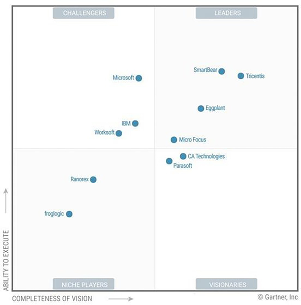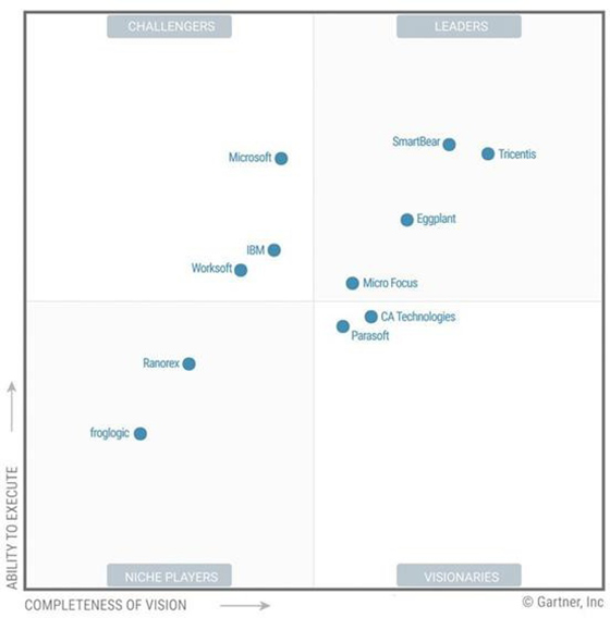 Cadranul testării automate care împarte furnizorii de top evaluați de către Gartner în patru categorii ( lideri, challengeri, jucători de nișă și vizionari), este prezentat în imaginea de mai jos: