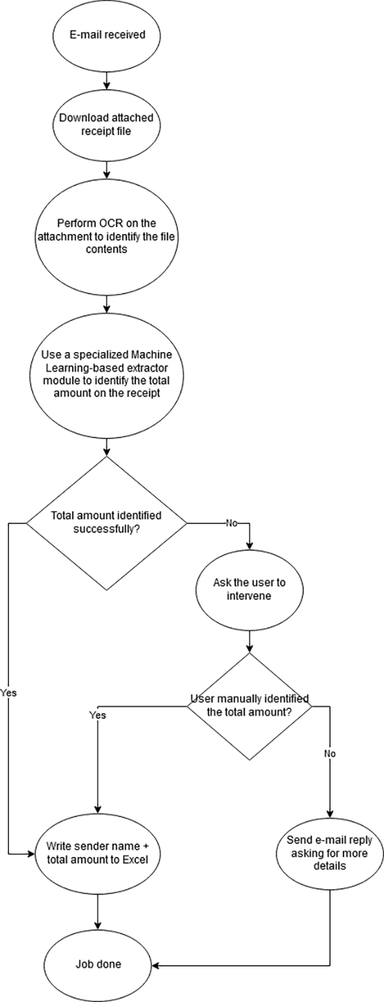 Să ne imaginăm următorul scenariu: un angajat dorește să i se deconteze valoarea unui bon fiscal. Pentru a face acest lucru trimite o copie scanată a bonului, pe e-mail, persoanei responsabile. Aceasta trebuie să monitorizeze contul de e-mail, să deschidă e-mailul primit și apoi bonul atașat, să citească bonul (eventual să-l rotească, dacă acesta nu a fost scanat vertical) pentru a vedea totalul și să noteze numele expeditorului împreună cu suma într-un fișier Excel. În cazul în care bonul nu a fost scanat corespunzător sau atașamentul nu este un bon, persoana va răspunde la e-mail cu un mesaj în care va solicita detalii suplimentare sau retrimiterea bonului.