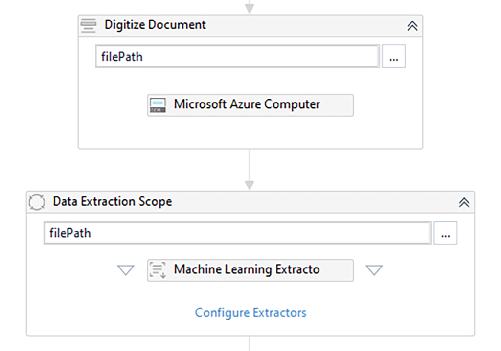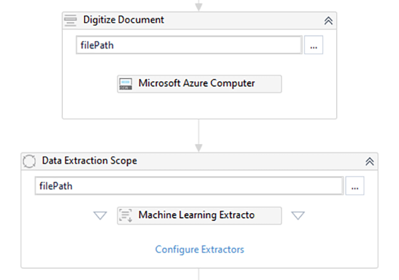 În continuare, urmează o parte esențială a întregului proces, și anume "citirea" documentului utilizând un engine de optical character recognition (Microsoft Azure Computer Vision OCR în acest caz, dar platforma UiPath conține mai multe astfel de engine-uri) folosind activitatea "Digitize Document". După ce obținem varianta text împreună cu metadata despre document, trecem la partea de extragere care se face cu ajutorul activității "Machine Learning Extractor". Acest extractor folosește un algoritm dezvoltat de UiPath, împreună cu un model de Machine Learning, pentru a extrage în mod automat informații esențiale din facturi sau chitanțe și bonuri fiscale. Putem vedea toate acestea în Figura 3.