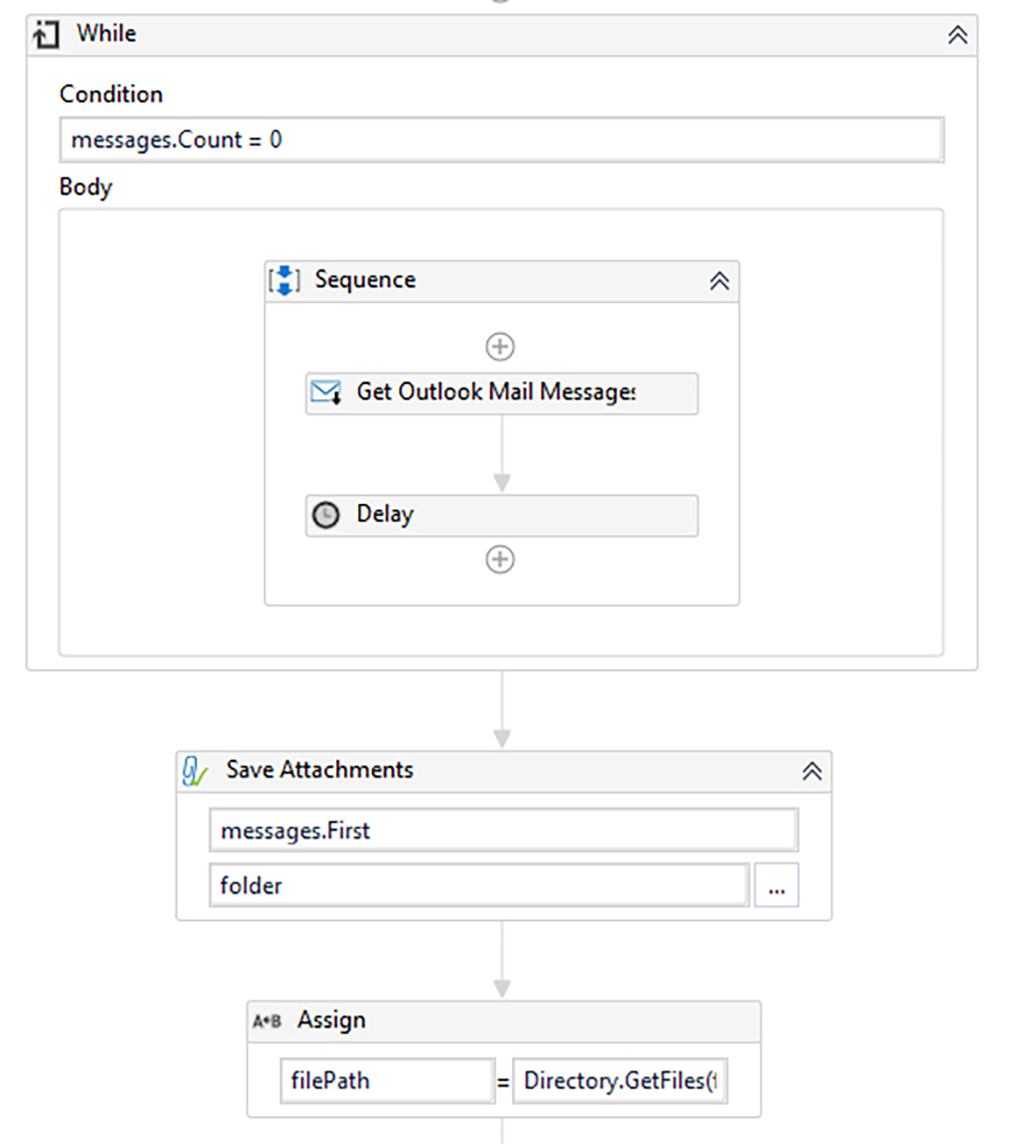 presupunând că acesta este configurat în Outlook și că robotul rulează în aceeași sesiune de Windows. În Figura 2 se observă cum putem utiliza activitățile "Get Outlook Mail Message" și "Save Attachments" pentru a aștepta sosirea unui e-mail într-un anumit folder și apoi salvăm atașamentele lui pe disc.