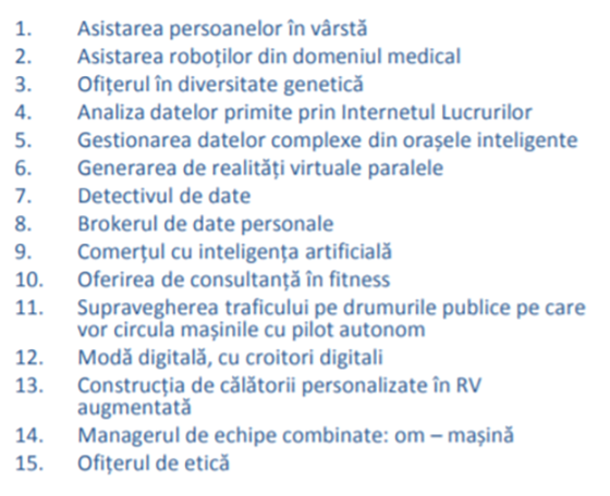 În mod cert, tehnologiile prezentate anterior vor crea noi tipologii de specializări: constructori, tehnicieni și programatori de roboți, designer de medii virtuale și proiectanți de produse 3D, persoane ce vor colabora pentru identificarea tratamentelor bolilor prezentului numiți Freelance Biohackeri, specialiști în instruirea sistemelor de AI, noul tip de antreprenor, analiști ai datelor IoT cu abilități de recunoaștere a tiparelor, de a pune întrebări inteligente și complexe și de sinteză a informației.