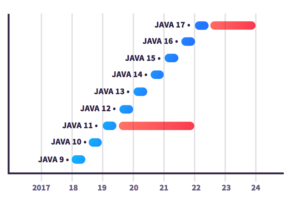 În imaginea de mai jos se pot vedea perioadele de suport pentru fiecare versiune de Java în parte. Cu albastru e perioada în care suportul e oferit în mod gratuit, de asemenea, perioada în care și versiunea corespunzătoare de OpenJDK acordată de Oracle este disponibilă.