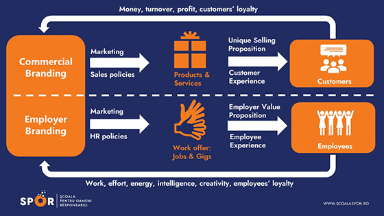 Dacă vorbim de același proces, aceleași tip de strategii și tactici, același vocabular și aceleași instrumente, ce ne împiedică să ne gândim strategia de employer branding ca o strategie de marketing, profund comercială, așa cum este absolut firesc? Și de ce nu începem să vorbim despre loializare, în loc de retenție? Retenția înseamnă a pune niște bariere în calea "clientului" care vrea să părăsească o relație, pe când loialitatea presupune construirea unor conexiuni, raționale și emoționale, care îl determină pe individ să rămână voluntar și fericit în interiorul unei relații. Nu vrem să transformăm oamenii în prizonieri, nu vrem să le punem cătușe (de parcă ar fi posibil...) ci vrem ca ei să ne fie parteneri voluntari, nu?