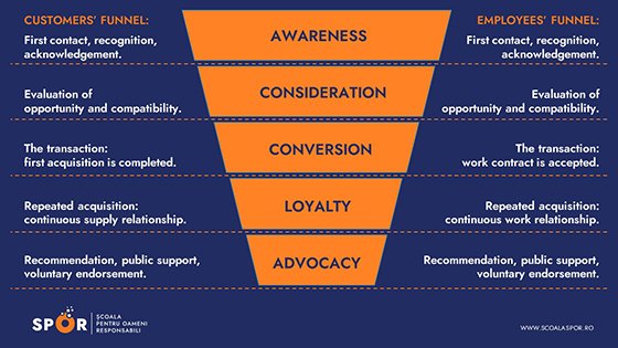 Da, recrutarea este astăzi un perfect exemplu de proces de vânzare, în care specialiștii implicați au în primul rând nevoie de abilități de marketing, comunicare, negociere și strategie. Să ne uităm la graficul al treilea ca să ne convingem: am descris aici în paralel tunelul prin care trece clientul-consumator (fie el B2B sau B2C) în relația cu organizația și pâlnia de transformare prin care trece clientul-angajat. Nu insist, dar putem observa cu lejeritate că sunt identice.