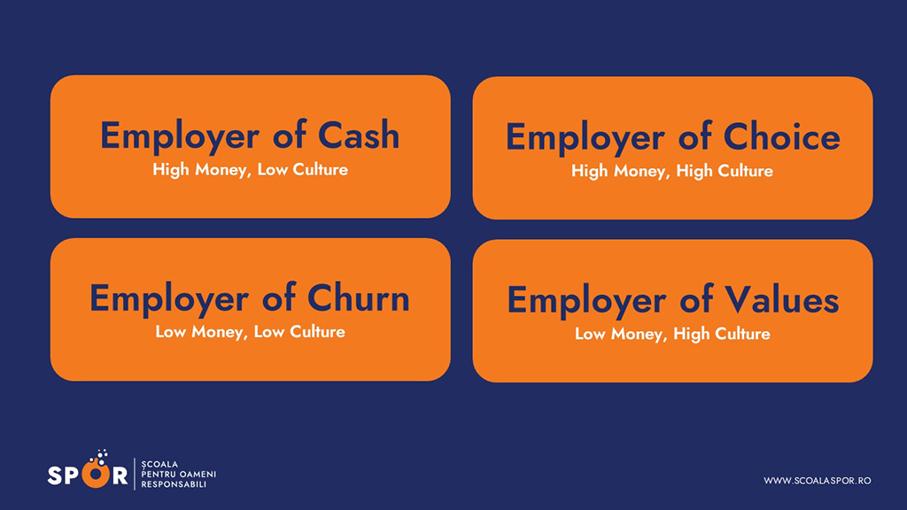 Atunci când avem situația exact opusă, adică o cultură excepțională, o experiență profesională extraordinar de atrăgătoare, dar capacitate de plată redusă în privința recompenselor, vorbim despre Employers of Values. În această categorie găsim în general startupurile și organizațiile neguvernamentale, care le dau echipierilor lor oportunitatea de a face lucruri importante, mărețe, pasionante și extrem de interesante, care oferă șansa de a învăța intensiv, rapid, de a experimenta, explora și cerceta, de a lucra cu oameni extraordinari într-un climat foarte prietenos, luminos, cald și inspirațional. Chiar dacă salariul nu este extraordinar de mare, de bonusuri nu prea poate fi vorba și nici oferta de beneficii suplimentare (asigurări, vacanțe, abonamente la sală, petreceri, traininguri etc) nu e foarte cuprinzătoare, experiența de a lucra în astfel de organizații este memorabilă. Am avut șansa de a face acest lucru și, garantez, este absolut fascinant și deosebit de util pentru dezvoltarea personală și profesională.