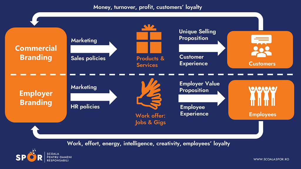 Trecem la analiza diapozitivului al doilea: în partea superioară vedem activitatea comercială a firmei, în partea de jos activitatea de recrutare. Ambele procese sunt tranzacționale, se produce un schimb între organizație și clientelă (comercială sau profesională). Observați că pe un canal organizația vinde produse sau servicii, folosind politici de marketing și vânzări, formulând o Propunere Unică de Vânzare, construind o Experiență a Clienților și primind de la consumatori bani, profit și achiziții repetate, adică loialitate. Pe celălalt canal, procesul este absolut identic: politicile de marketing și HR folosesc la punerea în piață a unei oferte de locuri de muncă, formularea unei Propuneri de Valoare pentru Angajați, dezvoltarea unei Experiențe a Angajaților și încasarea, în schimb, a prețului cerut: efortul, munca, inteligența și loialitatea talentelor abordate și convinse.