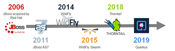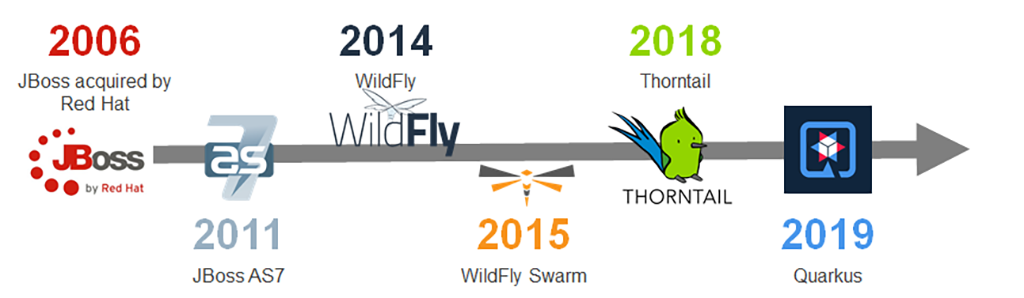 Istoria începe cu achiziția JBoss de către Red Hat în 2006. Aceasta a avut ca obiectiv accelerarea trecerii spre arhitectura orientată pe servicii (SOA), permițând aplicațiilor disponibile pe web să ruleze pe o platformă cu costuri reduse, open source. O altă etapă importantă a fost lansarea JBoss AS7 în 2011 ce a reprezentat un salt major care a avut în vedere refacerea arhitecturii frameworkului. Următorul pas a fost redenumirea JBoss AS în Wildfly (2014) ca rezultat al votului public al membrilor comunității JBoss. În 2015, Wildfly Swarm a fost introdus pentru a dezasambla WildFly AS și a reasambla suficient din acesta pentru a crea un executabil JAR self-contained, adică un fat JAR cu toate dependențele împachetate într-un fișier JAR. Acest lucru a inclus o versiune minimalistă a WildFly împreună cu dependențele obligatorii și codul aplicației. În iunie 2018, WildFly Swarm a trecut printr-un proces de rebranding, Red Hat considerând că numele nu mai avea sens. Termenul swarm avea conotații multiple, iar trecerea la o nouă arhitectură nu justifica menținerea numelui WildFly. Totuși, WildFly Swarm și Thorntail erau, de fapt, același proiect. Finalmente, după anunțul privitor la Thorntail 4.x, a existat un proiect intern la Red Hat ce a privit în mod holistic utilizarea Java în Kubernetes în contextul reducerii majore a consumului de resurse și a îmbunătățirii performanței. A fost ulterior lansat public drept proiectul Quarkus, care, dincolo de îmbunătățirea performanței și reducerea consumului de resurse, promitea o experiență de dezvoltare deosebită utilizând SmallRye pentru a implementa specificațiile Eclipse MicroProfile.