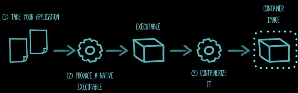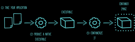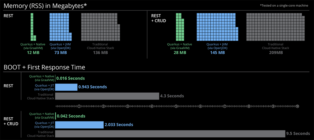 Stackul tradițional, nativ în cloud, din imagine, este un fat jar ce conține logica customizată de business, dependențele directe ale aplicației și mediul runtime Java EE care are o amprentă evidentă. O îmbunătățire semnificativă se poate observa când se folosește Quarkus + Open JDK la aproape jumătate de RSS având un timp de bootare de la zero de patru ori mai bun. Abordarea implică reducerea dinamicii (încărcarea claselor la runtime, reflecție, proxies etc.) unui runtime de tip enterprise, ceea ce înseamnă 90% din ecosistemul Java. Aplicațiile Spring boot bazate pe containere au un nivel suplimentar de abstractizare, ceea ce este complet inutil într-un mediu bazat pe containere. Aveți o aplicație Java ce rulează pe JVM într-un container ce nu se va schimba. În ziua de azi, livrabilul nu mai este aplicația, ci containerul, deci pachetul container și nu WAR-uri, de exemplu. Tot efortul de rulare a unei aplicații în JVM într-un container este inutil, deci AOT are sens dacă aplicațiile sunt împachetate în containere. Vestea bună este că majoritatea acestor lucruri se pot face la build time. Aici este locul unde Quarkus este puternic, oferind un ecosistem ce pune la dispoziție suport pentru AOT la build time, ceea ce face ca GraalVM să poată fi folosit de programatorii Java. În final, îmbunătățirea RSS și a timpilor de boot de la zero când folosim Quarkus + GraalVM reprezintă aspectul cel mai impresionant. Astfel, se profită de avantajele abordării complete a Quarkus pentru generarea executabilului specific (nativ) unui sistem de operare din codul Java ce este împachetat ca o imagine container.