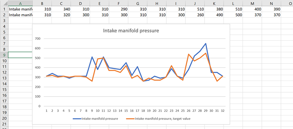 În cele ce urmează, dorim să vă prezentăm un grafic generat pentru a vizualiza presiunea aerului în admisie. Acest grafic cuprinde atât valoarea de referință, actualizată de ECU în funcție de parametrii de funcționare a mașinii cât și valoarea în timp real prezentată de senzorii autovehiculului. Odată cu stocarea unei baze de date specifice fiecărui autovehicul și motorizare în parte, vom avea posibilitatea de a detecta și semnala comportamente deviante (vezi Figura 4).