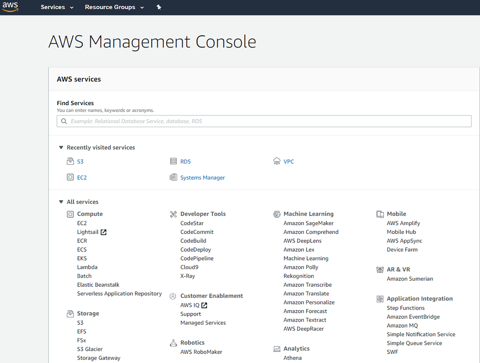 AWS oferă o varietate de servicii, de la mașini de calcul (ce pot fi computere fizice sau virtuale), la network access storage, domain name hosting sau monitorizare & networking. Aceste servicii sunt disponibile prin intermediul consolei AWS sau al API-urilor.