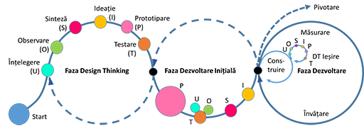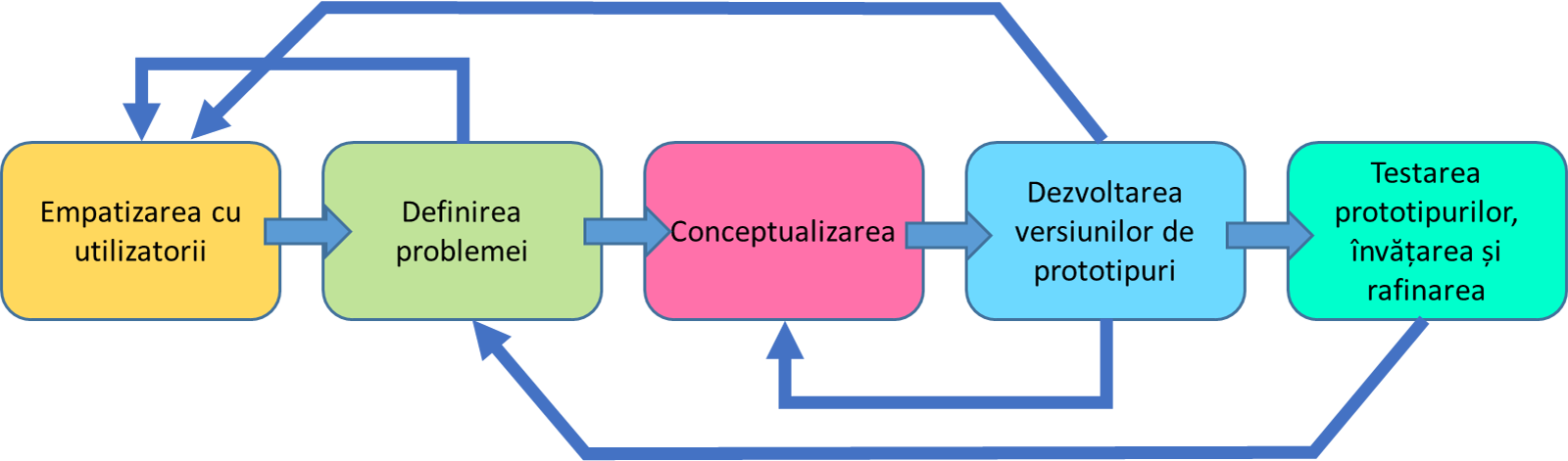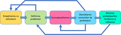 În ultimii ani a câștigat popularitate o altă paradigmă în dezvoltarea produselor noi, și anume proiectarea bazată pe gândire sistemică ("design thinking"). Acest model de proiectare accentuează colaborarea strânsă cu utilizatorul final pe parcursul fazelor de dezvoltare a produsului, începând cu procesul de investigare a nevoilor, continuând cu înțelegerea în profunzime a utilizatorilor din perspective multiple (roluri), urmând apoi cu un proces incremental de formulare a soluției prin bucle multiple la nivelul ideilor și prototipurilor (în colaborare strânsă cu beneficiarii soluției). Din perspectiva prototipării graduale și implicării profunde a utilizatorilor în procesul de design și dezvoltare, modelul design thinking împărtășește cu dezvoltarea agilă și inovația lean multe aspecte principiale. Ilustrarea fazelor principale ale modelului design thinking este prezentă în Figura 3.