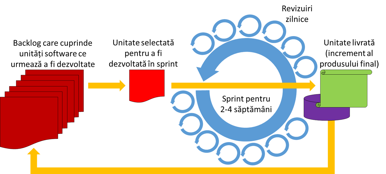 În SCRUM, sistemele software se dezvoltă în mici incremente care apoi sunt livrate pentru evaluare de către utilizatori încă din fazele timpurii ale procesului de dezvoltare, astfel încât toate ajustările necesare, îmbunătățirile și ideile noi rezultate din interacțiunea cu prototipul livrat să poată fi încorporate în timp util în sistem. Fiecare etapă de incrementare este denumită "sprint" și durează între două și patru săptămâni, cu ședințe de progres la fiecare 24 ore, în care sunt implicați atât echipa de dezvoltare cât și proprietarul sistemului. Schema simplificată a acestui proces este ilustrată în Figura 1. Kanban, o altă metodologie de tip agil, diferă de SCRUM în câteva puncte precum ar fi: schimbările se pot întâmpla în orice moment, ciclurile de lucru urmează fluxul de lucru, nu utilizează biblioteca de comenzi nerezolvate ("backlog pool"), nu include roluri etc.