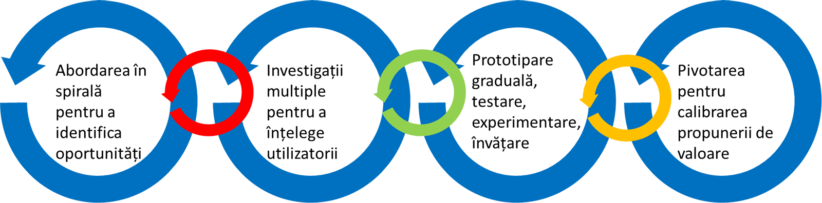 Pe baza acelorași principii, ca și în cazul metodologiilor agile (ex. incertitudine și informații incomplete în definirea soluției în etapele timpurii ale proiectului, descoperirea continuă prin prototipare și testare, implicarea echipei de utilizatori în direcționarea dezvoltării, în co-creare și "feedback") inovațiile conduse de tehnologie au adoptat în ultima decadă așa numita abordare "lean" (suplă). În inovația lean, fiecare fază a evoluției proiectului implică un model în spirală de prototipare graduală și pivotare a soluțiilor prin testarea ipotezelor și ajustarea acestora din reacția primită de la beneficiarii finali. Astfel, fazele principale ale inovației lean (adică, introspecția, înțelegerea problemei, formularea soluției și proiectarea modelului de afaceri) sunt abordate într-o formă progresivă, cu o prototipare graduală și pivotare, cu învățare rapidă și rafinare a soluției, astfel încât să fie evitată perpetuarea aspectelor care nu aduc valoare. Se poate observa că, între dezvoltarea agilă și inovația lean este un sincronism puternic. Ilustrarea grafică a inovației lean se face în Figura 2.