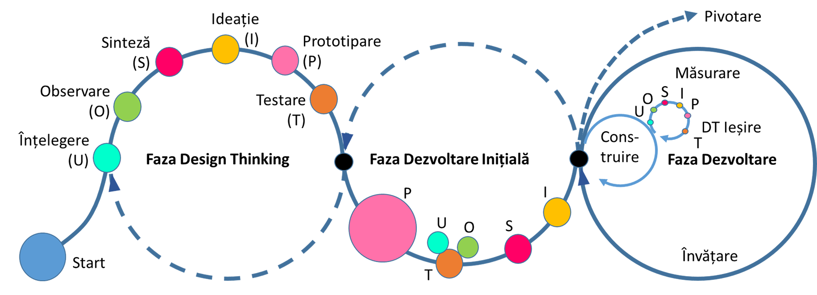 În conformitate cu modelul InnoDev, în faza de design thinking se pune accentul pe fundamentarea viziunii soluției la problemă. Viziunea rafinată și realizarea proof-of-concept (sau produsul minim viabil (MVP)) sunt cuprinse în faza de dezvoltare inițială. În a doua fază se proiectează și se testează conceptele pentru interfața cu utilizatorul, se analizează și testează posibilele tehnologii și se implementează cele mai importante caracteristici ("features") pentru a asigura o tangibilitate a conceptului (ex. viabilitate, dezirabilitate, fezabilitate). În faza de dezvoltare se testează MVP-ul și se continuă iterațiile de tip agil până la obținerea soluției finale, iar uneori se includ și pivotări. Modelul InnoDev poate produce confuzii în implementare, deoarece este dificil de trasat granița între design thinking și abordarea agilă.