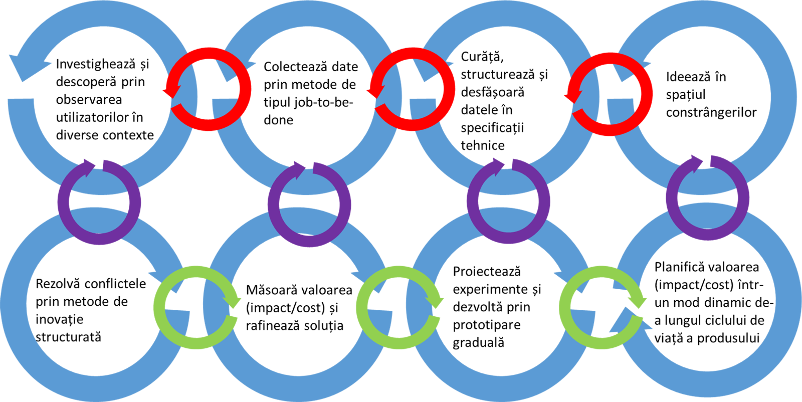 În continuare se propune o soluție de hibridizare "management agil - inovație lean - design thinking - inginerie competitivă" care preia punctele tari din cele patru concepte și ține cont de specificitățile evidențiate în Tabelul 1. Modelul propus se numește CALDET (Competitive Agile Lean DEsign Thinking) și este ilustrat în Figura 8.
