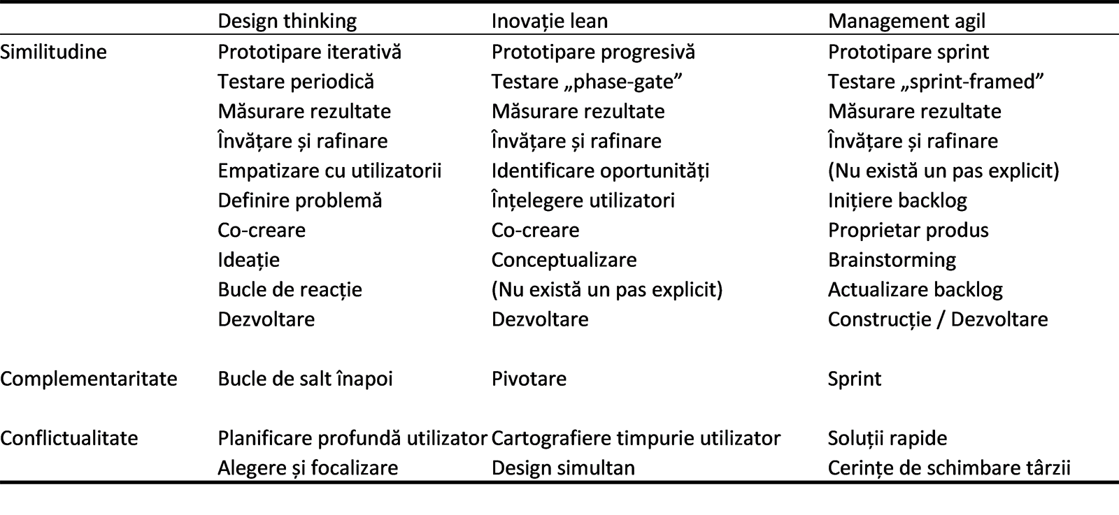 Cheia în ingineria competitivă este utilizarea unor instrumente prin care se poate cuantifica impactul adus de fiecare modul, funcționalitate etc. din produs în competitivitatea acestuia. Prin raportarea la costurile implicate este posibilă cuantificarea valorii încorporate în fiecare componentă a produsului. Astfel, caracteristica "lean" poate fi identificată cu claritate. Pentru integrarea corectă a conceptului de inginerie competitivă în hibridul "management agil - design thinking - inovație lean" este necesară o analiză mai detaliată, vizualizată în Tabelul 1.