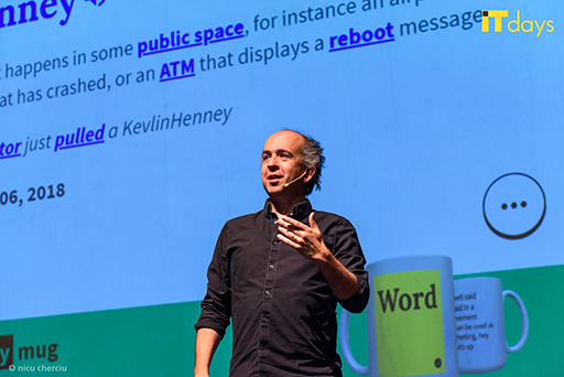 După pauză, a urmat prezentarea keynote a lui Mark Seemann, participant ca speaker pentru a doua oară la IT Days. Anul acesta, tema acestei ediții, #programmingARt, i-a oferit pretextul de a crea analogii surprinzătoare între diferite momente din cultura umanității și recentul domeniu al programării. Marea epopee a civilizației Mesopotamiei antice, a lui Ghilgameș, sau consacratele poeme homerice, Iliada și Odiseea, s-au construit în jurul unui nucleu narativ, care, de la generație la generație, a fost reiterat și amplificat în scheme narative mai complexe, peste care s-au sedimentat noi conținuturi. Abordate în această cheie, poemele se dezvăluie ca niște structuri care intermediază perpetuarea conținuturilor culturale și mentalitare ale unei civilizații.