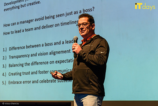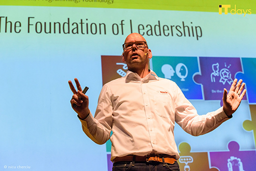 Leadership in development a fost subiectul abordat de Chris Lederer. Prezentarea a început cu diferența dintre un șef și un lider. Din perspectiva lui Chris, totul se reduce la câtă informație te aștepți să primești de la cei din echipă. Dacă te comporți ca un șef aceasta este zero, pentru că toată lumea conștientizează că taskul trebuie doar terminat și atât. În schimb, asumarea atitudinii de lider creează avantajul că taskurile se realizează și în absența liderului, pentru că acesta și-a arătat încrederea în echipă. Exemplul personal a lui Chris este un argument decisiv în favoarea manierei de a fi un lider al echipei și nu un șef. Modul în care conduce echipa din Cluj- vine o dată la șase săptămâni, pentru a discuta cum merg proiectele, dar nu neapărat din perspectiva tehnică- este elocvent. De asemenea, discuția abordată dintr-o perspectivă personală, este dacă se simt provocați de taskurile lor, dacă sunt motivați și dacă dispun de tot ceea ce este necesar pentru le putea îndeplini. În opinia lui Chris, adresarea acestor întrebări trebuie să reprezinte responsabilitatea oricărui lider, dacă se dorește ca proiectul în lucru să fie unul de succes.