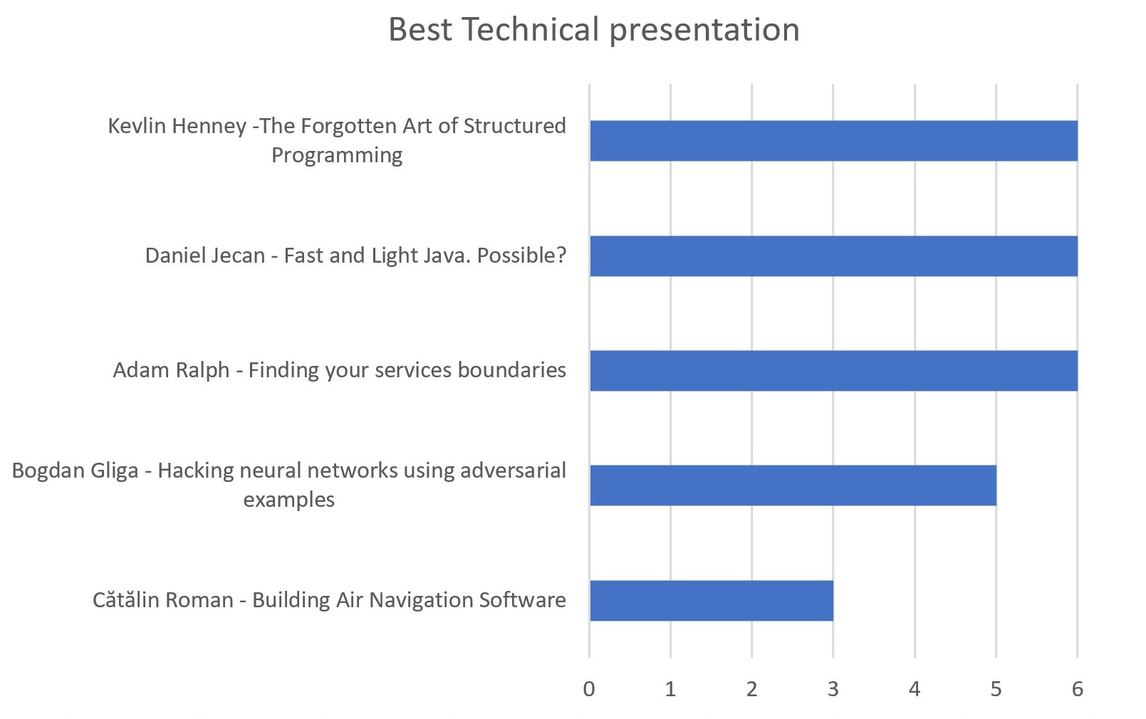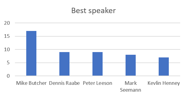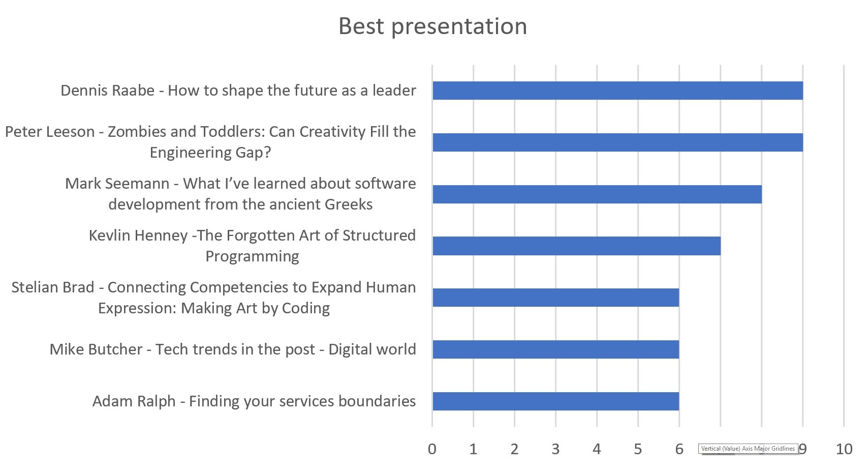 Cel mai votat speaker a fost Mike Butcher, urmat de Dennis Raabe, Peter Leeson, Mark Seeman și Kevlin Henney.