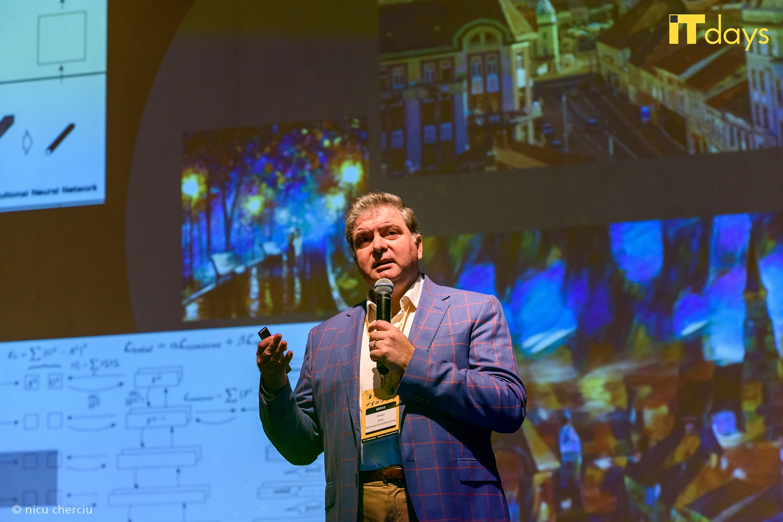 Prezentarea Connecting Competencies to Expand Human Expression: Making Art by Coding realizată de prof. Stelian Brad, care a deschis prima zi a conferințe, a oferit publicului ocazia de descoperi modul în care programatorii pot să genereze aplicații artistice în domenii precum vizualizare grafică sau muzică. Un argument în sensul acesta îl oferă o pictură care a fost realizată prin utilizarea de algoritmi AI-Generative Adversial Network (GAN) și prin analiza unui set de 15000 de portrete pictate între secolele 14 și 20. Dovada succesului acestei opere de artă este faptul că a fost vândută de casa de licitații Christie din New York. Un alt exemplu al relației dintre domeniul artistic și cel tehnic se referă la valorificarea rețelelor neuronale convoluționale pentru a transforma fotografii în pictură. Concluziile prezentării au stabilit că programarea și AI-ul aduc în prim plan, un nou tip de artă- de neconceput odinioară- care, însă, nu se poate substitui geniului creator al artiștilor.