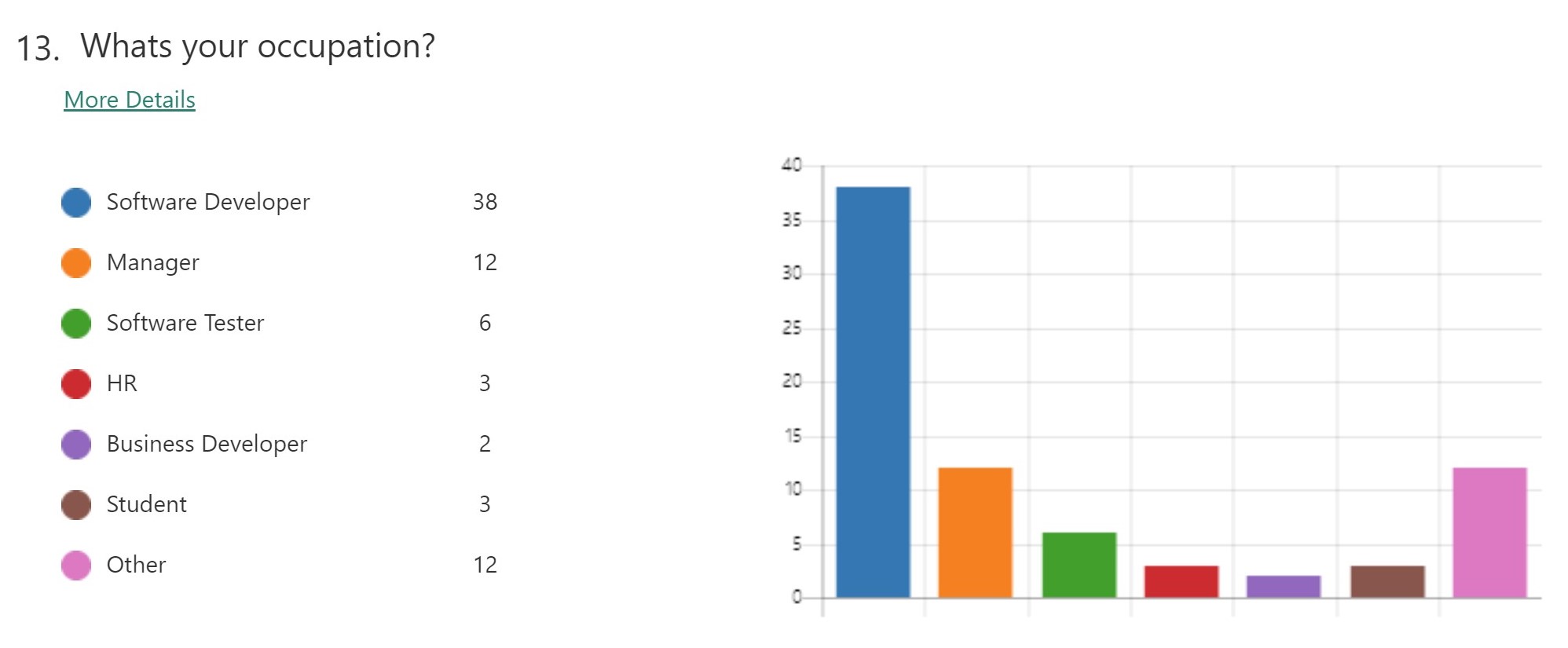 Majoritatea participanților au fost programatori urmați la o distanță apreciabilă de manageri și testeri.