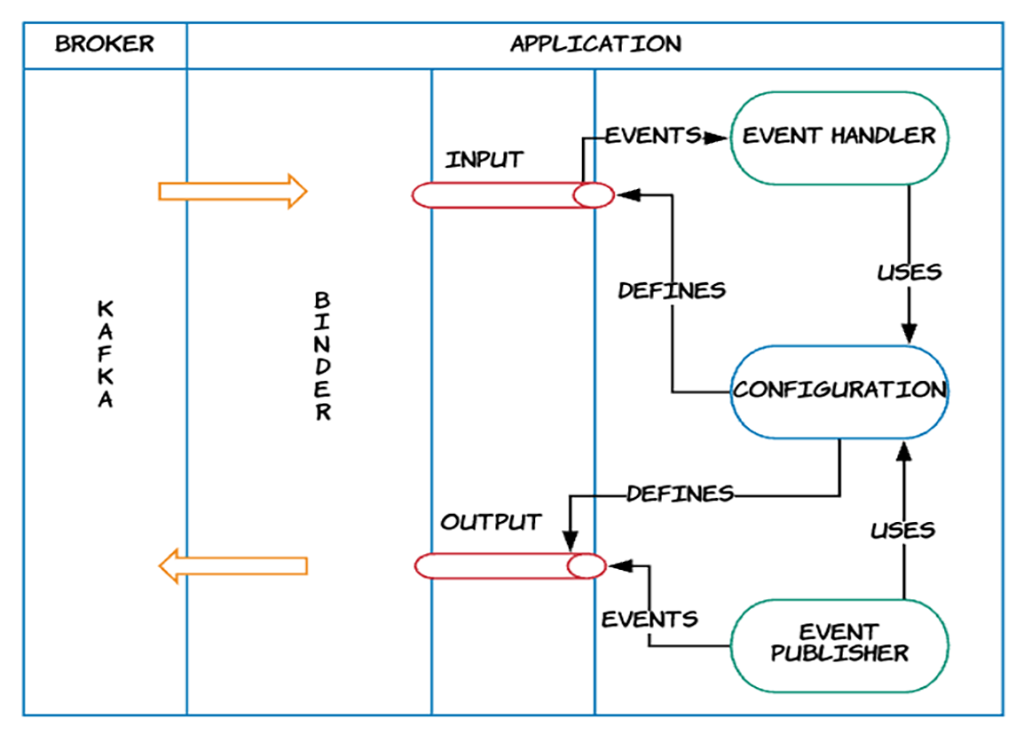 Frameworkul permite utilizarea proprietăților pentru a crea configurările destinațiilor de mesaje. Exemplul de mai sus creează două legături, una către topicul order_created, cealaltă către order_validated. Acestea leagă aplicația de topicurile externe din Kafka. Pentru a crea un consumator, trebuie să fie configurat un canal de intrare. Acesta se va lega de o destinație specifică declarată în proprietăți. @EnableBinding marchează configurarea și trebuie să referențieze o clasă care conține definiția canalului de intrare. Canalul este declarat folosind adnotarea de @Input.