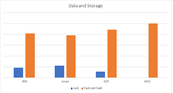 Din punctul de vedere al datelor NO(SQL) și al stocării acestora, furnizorii de cloud sunt mai modești. În medie, oferta IaaS, comparativ cu PaaS și SaaS, este aproximativ 15%. Serviciile primare oferite de AWS pentru date/stocare de date sunt toate PaaS și SaaS.