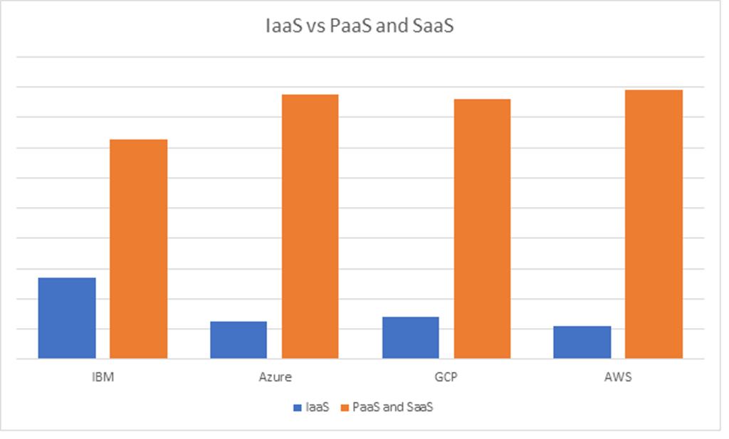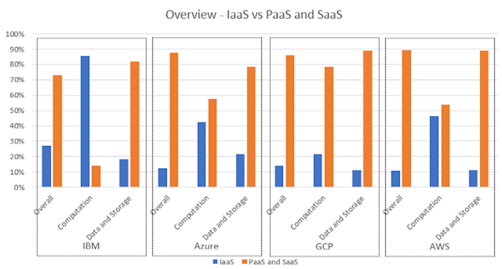 Rezultatul inițial a fost interesant, dar nu șocant. AWS și Azure - lideri în cloud public - au mai puțin de 12% dintre serviciile lor sub formă de IaaS. Spre comparație, IBM are mai mult de 27% din servicii sub formă de IaaS.