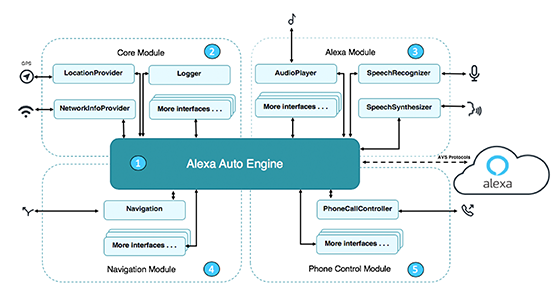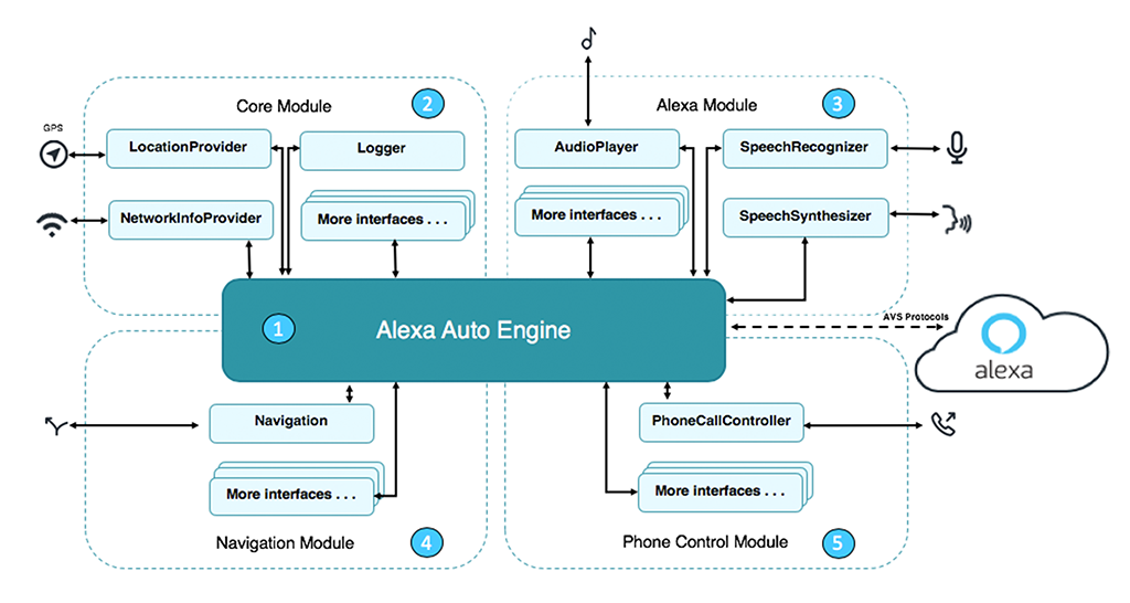 Toate celelalte module disponibile sunt alcătuite din interfețe pe care dezvoltatorii software trebuie să le implementeze pe platforma țintă. Interfața modulului Navigation este principalul punct de interes pentru următoarele secțiuni, fiind modulul prin care aplicația de navigare a platformei va comunica cu Alexa. Modulul Phone Control este răspunzător de generarea evenimentelor de control telefonic, modulul Address Book este responsabil pentru stocarea contactelor și a locațiilor preferate de navigare, modulul Alexa Presentation Language acordă o soluție de interfațare cu componente personalizate de tipul Alexa Skills, în timp ce modulul Car Control oferă modalități prin care Alexa poate interacționa cu dispozitivele hardware specifice mașinii, cum ar fi motoarele ferestrelor, ventilatoarele, regulatoarele de temperatură etc.