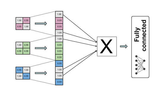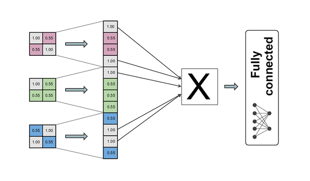Fiecare imagine de 2x2 pixeli este translatată într-un vector coloană (4x1) care este unit cu ceilalți vectori coloană. Pixelii care indicau cele 3 trăsături ale literei "X" în pozele de 2x2 vor vota acest lucru şi din vectorul coloană. Acesta este dat ca intrare la o rețea neuronală de tip fully connected pentru a interpreta corect rezultatul (fig. 12).
