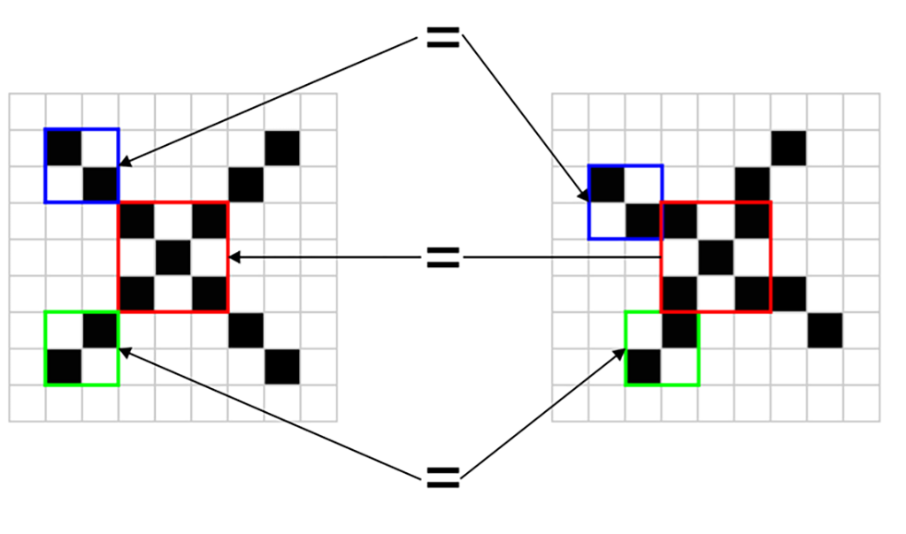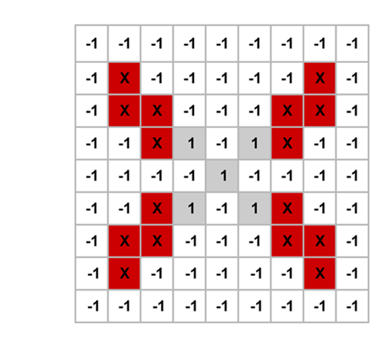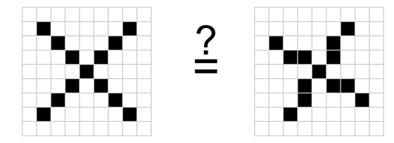 Pătrățelele negre sunt înlocuite cu valoarea "1" şi cele albe cu "-1" pentru a se simplifica calculele. Calculatorul va compara imaginile la nivel de pixel şi va observa că sunt diferențe. Răspunsul va fi un categoric "NU, nu indică acelaşi lucru!" (fig. 5).