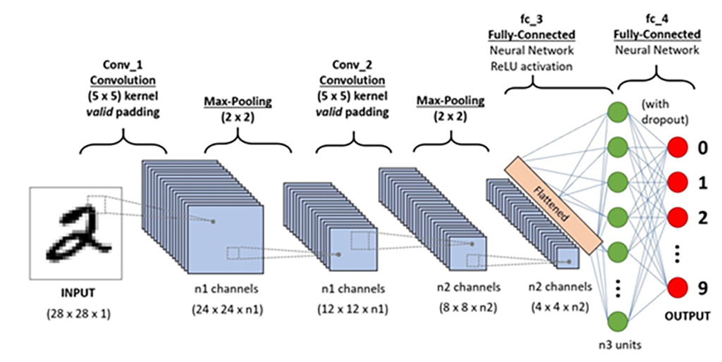 O astfel de rețea poate să aibă o împărțire ca în fig. 1. Ca input este dată o imagine (de exemplu, o poză cu cifra 2). Această imagine este trecută prin mai multe straturi, ca în final să dea ca rezultat cifra "2".