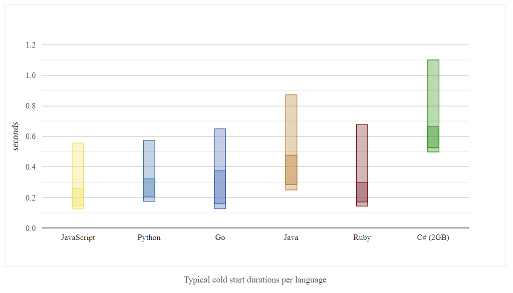 Mikhail Shilkov, în articolul său [31], a prezentat un grafic în legătură cu timpul cold start în funcție de limbajul de programare.Conform măsurătorilor sale, funcțiile scrise în Node.js au cel mai mic cold-start, depinzând bineînțeles și de dimensiunea codului.