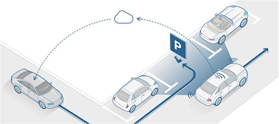 Serviciile de parcare asistată au intrat în era IoT (Internet of Things): imaginați-vă că puteți vedea, în timp real, care loc de parcare de pe marginea drumului este disponibil lângă destinația dumneavoastră. Singura condiție este ca o mașină conectată la Cloud să treacă pe lângă acel loc de parcare. Bosch lucrează la astfel de sisteme în care mașinile, dotate cu sisteme de parcare automată, scanează continuu locurile de parcare disponibile. Informația este apoi încărcată în Cloud și pusă la dispoziția celor ce caută un loc de parcare.
