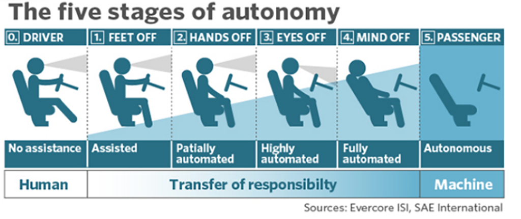 O abordare clasică a conceptului de conducere autonomă este că sistemele de conducere asistată vor scuti conducătorul auto de sarcini din ce în ce mai complexe, până când acesta va deveni un simplu pasager [1][2]. De exemplu, pilotul automat (cruise control) pe un drum liber permite unui conducător auto să nu mai folosească pedalele. Sistemele de asistență la menținerea benzii (line assist) permit unui conducător auto să nu fie nevoit să țină mâinile pe volan. Sistemele de asistență în ambuteiaje (jam assit) permit păstrarea unei distanțe stabile față de mașina din față, conducătorul auto nefiind nevoit să se uite mereu la drum, în timp ce cele mai avansate sisteme de conducere asistată vor permite conducerea autonomă în condiții specifice: între două ieșiri de pe autostradă sau de pe alee în garaj - acesta din urmă fiind un scenariu complet autonom. Această abordare nu limitează opțiunile conducătorului auto, precum viteza maximă sau deplasarea pe drumuri ce nu sunt cartografiate, deoarece conducătorul va putea să oprească sau să anuleze orice funcție sau comandă autonomă.