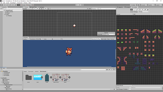 Din Tile Palette selectăm opțiunea de Paint (B) selectăm un tile pentru pământ și desenăm o bază. Vom observa că elementele sunt prea mici desenate în scenă. Pentru aceasta va trebui să redimensionăm celulele.