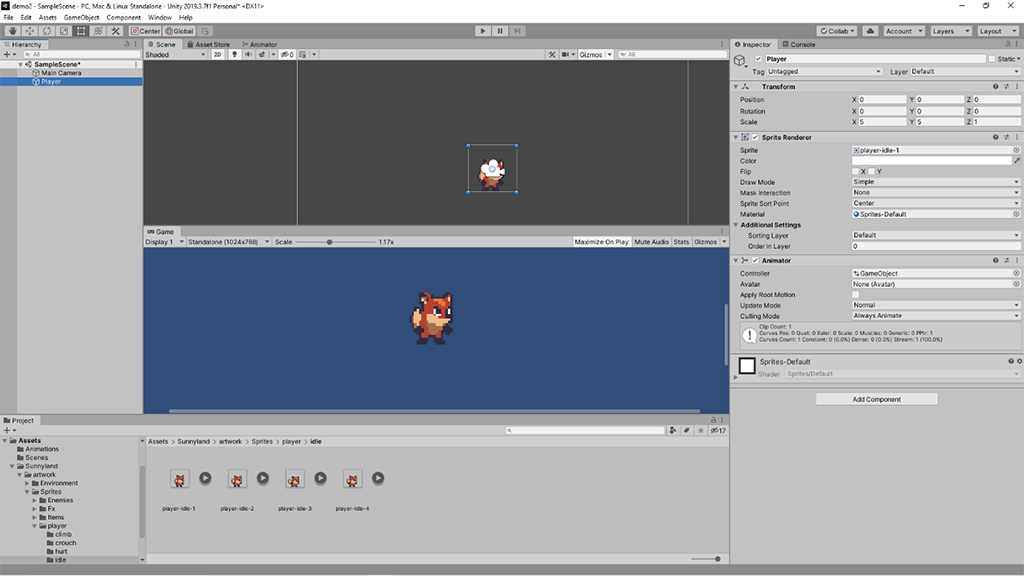 Mergem în folderul AssetsSunnylandartworkSpritesplayeridle și selectăm toate cele patru resurse: player-idle-1 ... 4. Realizăm un drag & drop al acestora peste obiectul Player.