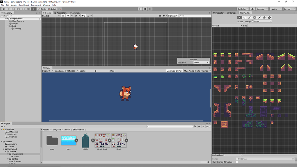 În continuare, vom adăuga un teren peste care se va mișca caracterul. Primul pas este să creăm un Tilemap: