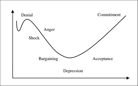 Kübler-Ross explică în teoria lui cum mintea umană procesează schimbarea trecând prin următoarele trepte: negare, furie, târguială, depresie și în final, acceptare. Curba schimbării este un model puternic, aplicat în ambele registre, personal sau profesional. Cu cât înțelegi mai repede stadiile prin care treci, cu atât vei accelera procesul și vei ajunge mai repede la etapa de Commitment.