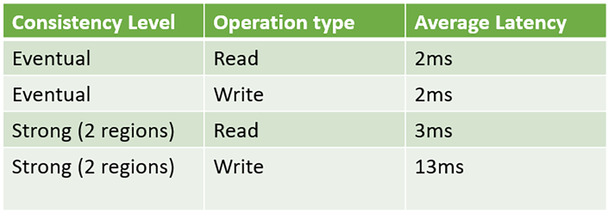 Pentru nivelul de consistență Strong și baze de date din regiuni multiple, latența este mai mare, dar acest lucru este de așteptat, date fiind cerințele ce țin de replicare (copiere). De exemplu, dacă avem nivel de consistență Strong pe o bază de date care este replicată (copiată) în două regiuni diferite, latența ar fi egală cu timpul necesar pentru a efectua două ture complete între regiunile cu cel mai lent transfer plus 10ms latență în 99% dintre cazuri. Cele 10ms suplimentare au ca sursă operația de citire (confirmare) necesară pentru a ne asigura că operația a fost realizată cu succes.