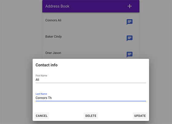 ContactForm ne permite adăugarea de noi elemente. Așa cum se vede în codul de mai jos, componenta acceptă trei parametri: id, firstname și lastname. Prezența id-ului indică faptul că avem o operație de update, iar în caz contrar vom avea o operație de definire a unui contact. Datele folosite sunt: