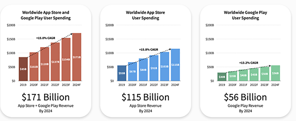 Compania App Intelligence Sensor Tower a publicat o previziune revizuită a pieței pentru 2020-2024, conform căreia cheltuielile consumatorilor la nivel mondial pentru aplicații mobile se estimează că vor ajunge la 171 miliarde dolari până în 2024, mai mult decât dublul celor 85 miliarde dolari față de 2019.