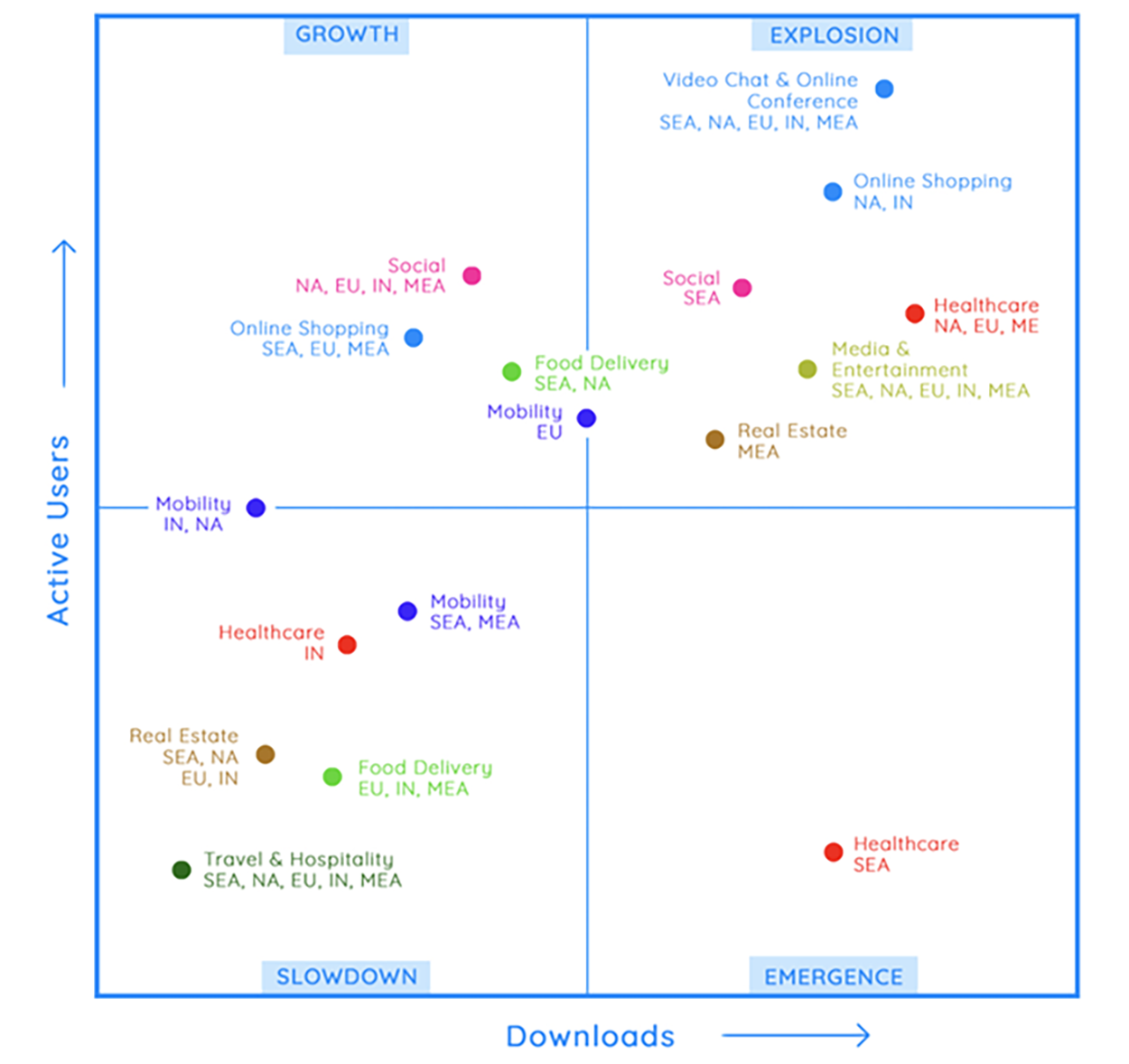 Câștigătorii de necontestat în această perioadă COVID-19 sunt aplicațiile din industrii precum munca / comunicarea la distanță, educația, social media și cumpărăturile online. Deși utilizatorii activi zilnic ai aplicațiilor de asistență medicală din Asia de Sud-Est și India sunt în scădere, a existat o creștere de 110% a cheltuielilor cu aceste aplicații în timpul pandemiei, în timp ce utilizatorii activi zilnic și descărcările au explodat în America de Nord, Europa și Orientul Mijlociu.