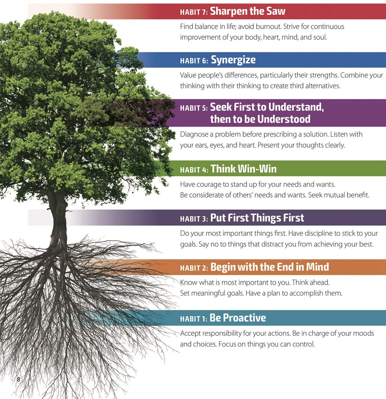Autorul prezintă șapte obiceiuri/deprinderi/obișnuințe/paradigme sau atitudini, care, dacă sunt adoptate și aplicate, pot îmbunătăți rezultatele profesionale și personale.