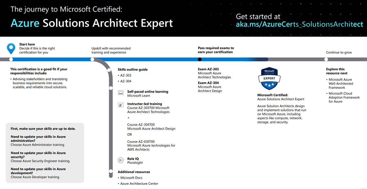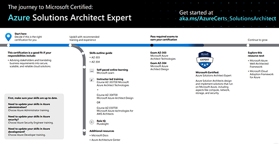 Microsoft aduce schimbări importante în structura și formatul cursurilor de certificare pentru arhitecții de soluții Azure, înlocuind formatele vechi AZ-300: Microsoft Azure Architect Technologies (livrat ca un pachet de 5 cursuri de o zi) si AZ-301: Microsoft Azure Architect Design (livrat ca un pachet de 4 cursuri de o zi) cu noile formate AZ-303: Microsoft Azure Architect Technologies și AZ-304: Microsoft Azure Architect Design. Această schimbare aliniază structura cursurilor la actuala formă a competențelor și aptitudinilor necesare unui Azure Solution Architect 2020, ce ține cont de evoluția accelerată a platformei Azure.