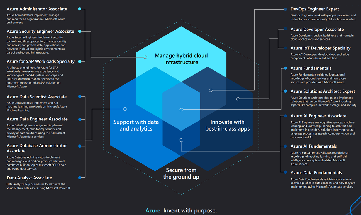 Microsoft Azure, 7 certificări - administrator, database administrator, data engineer, data scientist, developer, security engineer, developer și AI engineer
