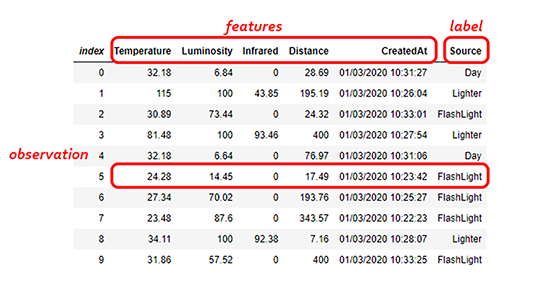 Putem observa câteva elemente speciale în imaginea de mai sus. O observație este echivalentul unei citiri, un rând cu un set de valori. Coloanele sunt variabile în setul de date. O etichetă (label) sau o coloană țintă este o coloană specială, cea pe care încercăm să o prezicem. Orice coloană poate fi o etichetă, în funcție de problema pe care încercăm să o rezolvăm.