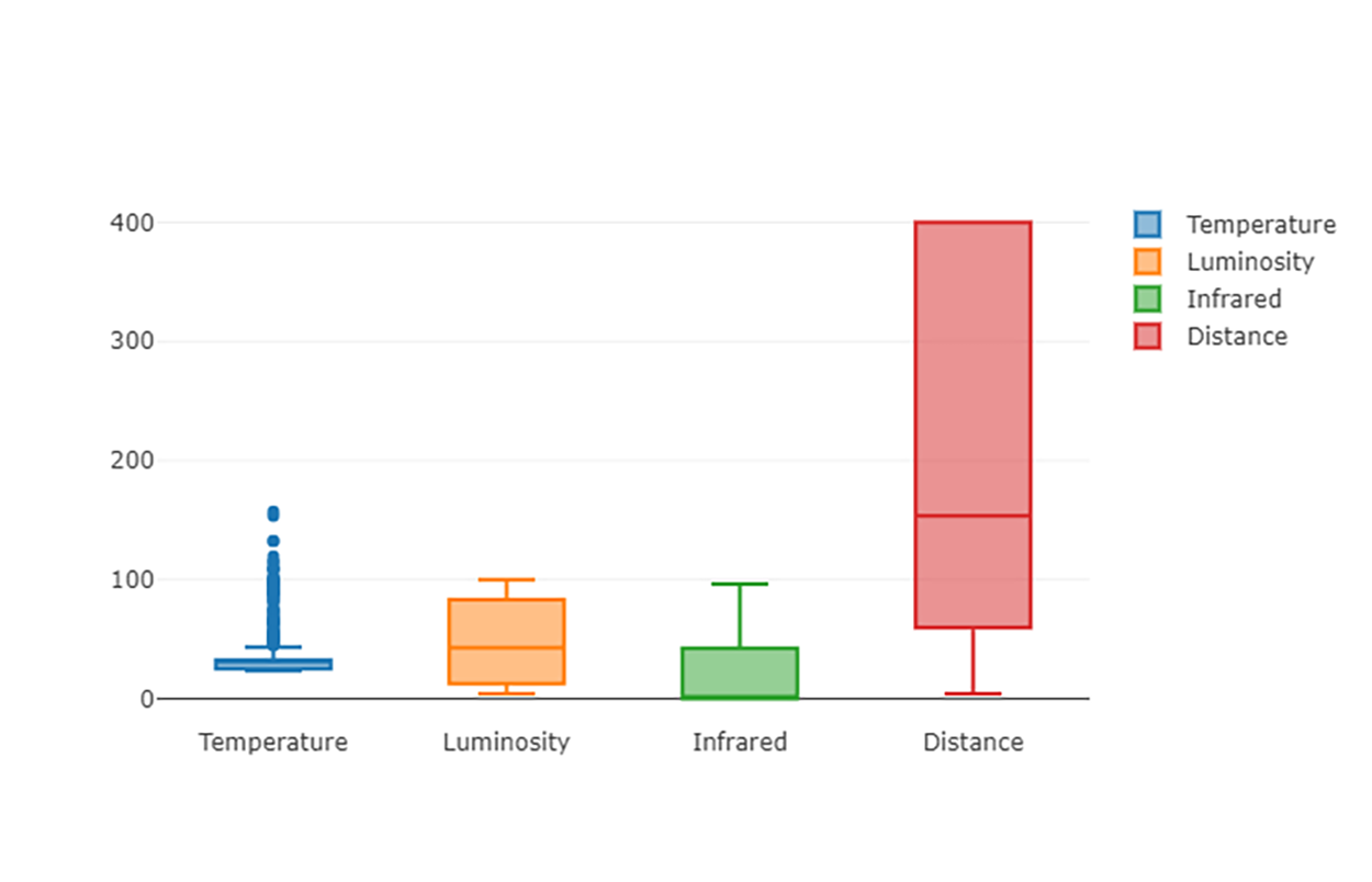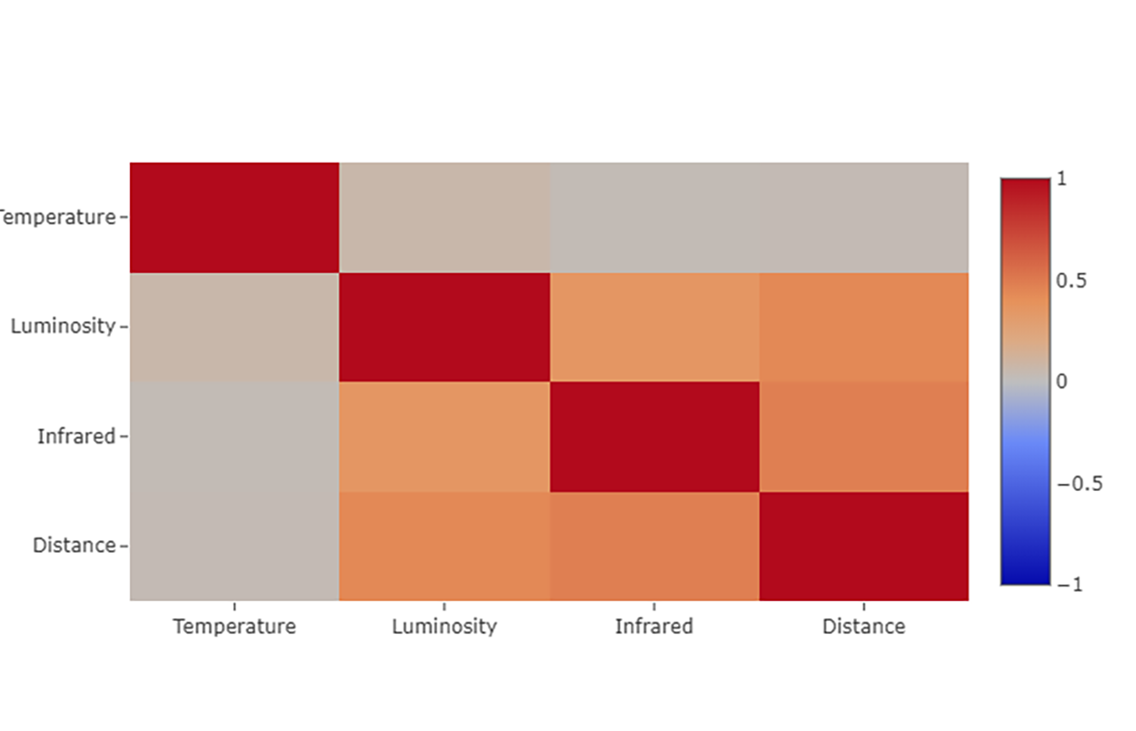 De exemplu, cele mai corelate coloane sunt Distance și Infrared (0.48), iar Temperature este cea mai puțin corelată coloană comparativ cu celelalte.