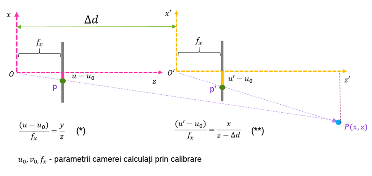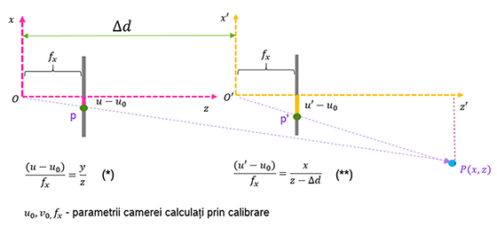Considerăm o vizualizare top-view a unei camere al cărei centru se deplasează cu ∆d din O în O', și proiecțiile p și p' ale unui punct P în cele două poziții succesive ale camerei. Coordonatele punctului P sunt (x,z) în sistemul de coordonate al camerei O, respectiv (x,z-∆d) în sistemul de coordonate al camerei O'. Folosind triunghiuri asemenea, se pot deduce ecuațiile (*) si (*). Observam că dacă u, u' (capetele unui vector de flux optic - vezi Figura 3) și ∆d* (mișcarea camerei) sunt cunoscute, atunci putem calcula valorile (x,z) reprezentând poziția 3D a acestuia. Ecuații similare se pot scrie pentru o proiecție laterală a scenei, rezultând și coordonata y a punctului P(x,y,z). Desigur că în realitate modeulul matematic se complică, mișcarea nu va fi pe o singură axă ci va fi compunerea unei rotații și a unei translații, iar determinarea punctului 3D trebuie să considere precizia cu care estimăm capetele vectorului de flux optic.