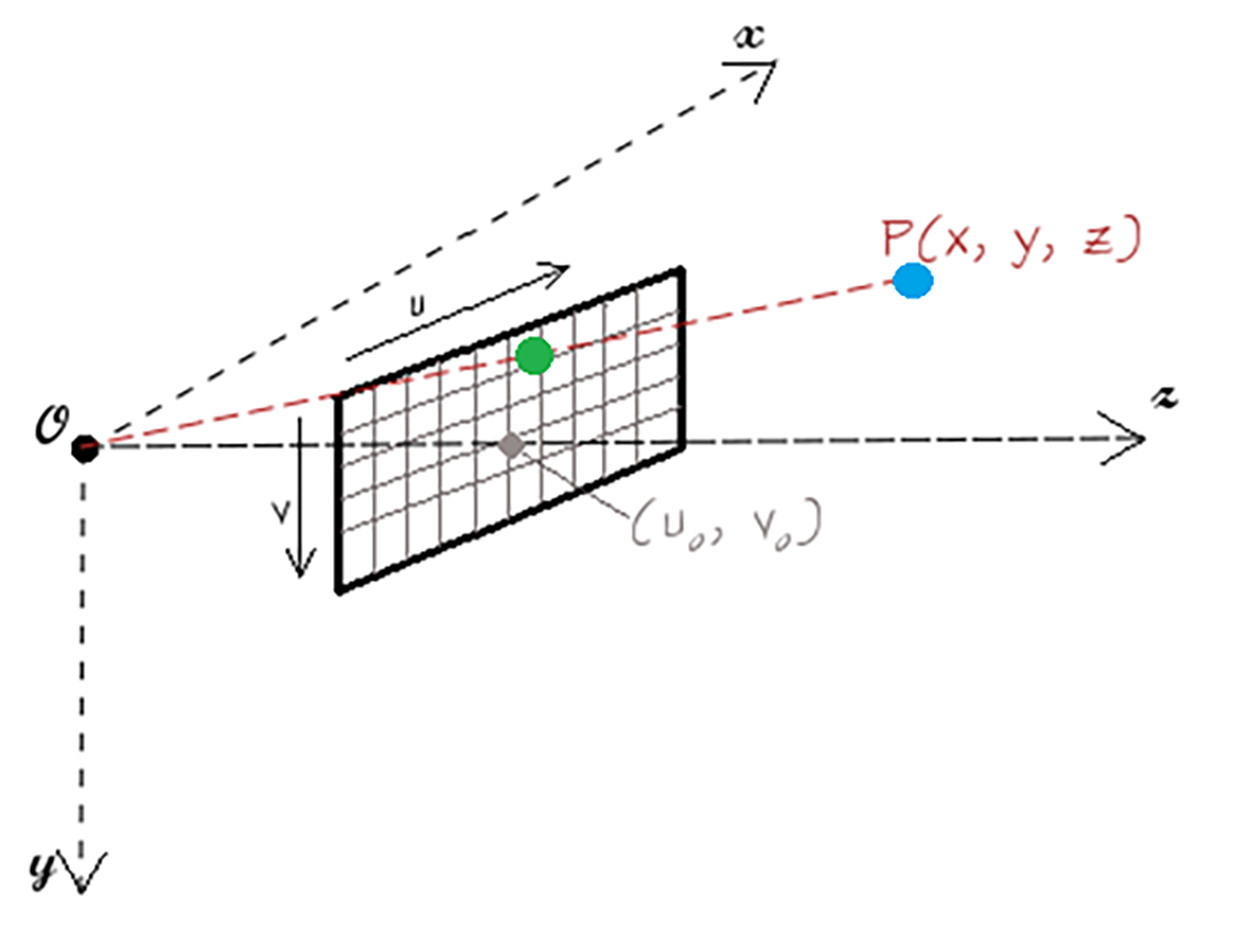 Figura 5 - Modelul de proiecție al perspectivei, valabil după eliminarea distorsiunilor. Punctul P marcat cu albastru în figură se proiectează pe imagine în pixelul marcat cu verde, unind punctul P cu centrul O de proiecție al camerei.